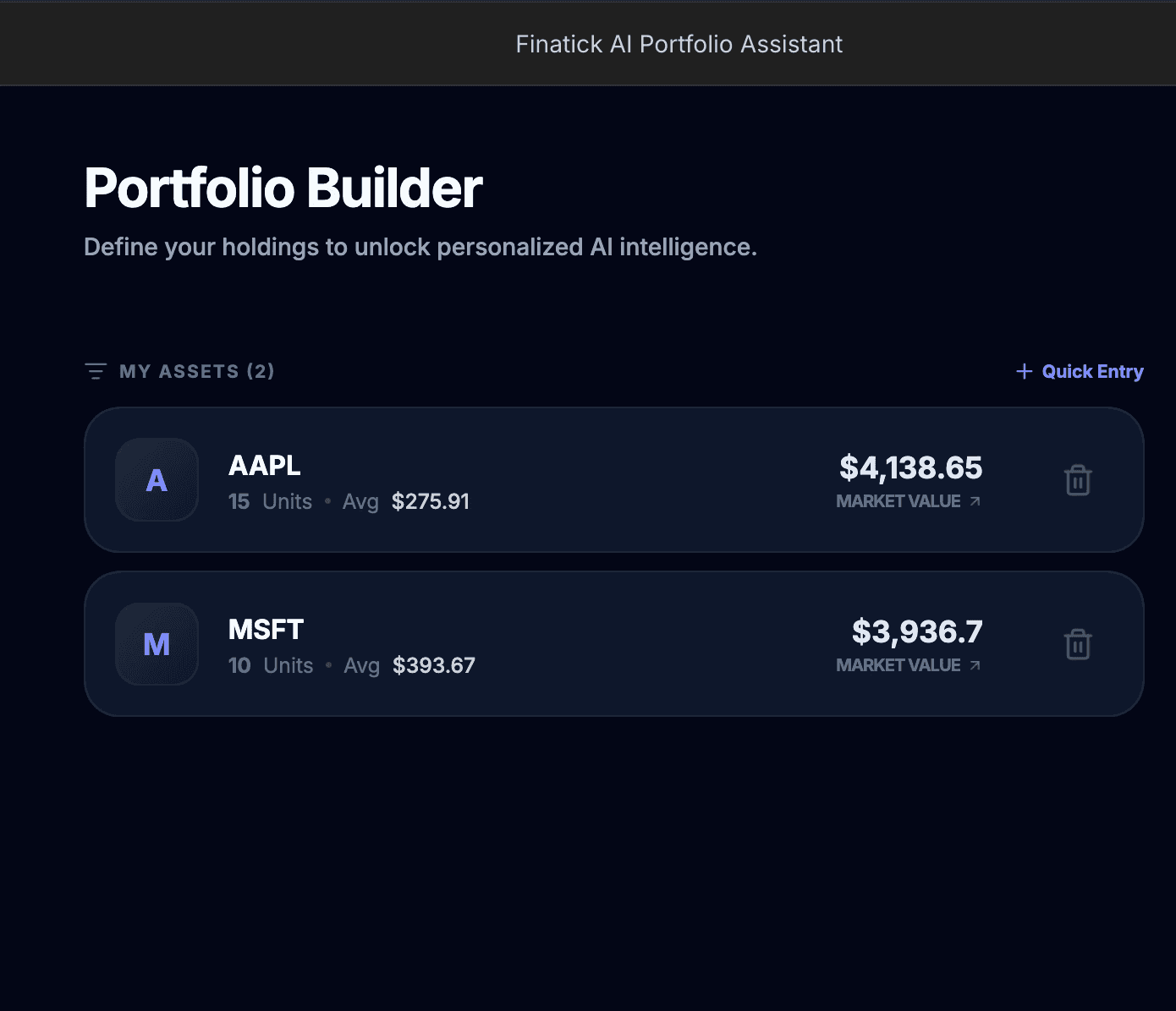 Link or build your portfolio from scratch, with the assistance of Finatick AI.